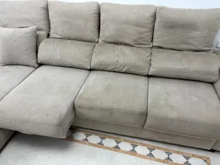 Sofá chaiselongue con canapé con desgaste del uso, color beige
