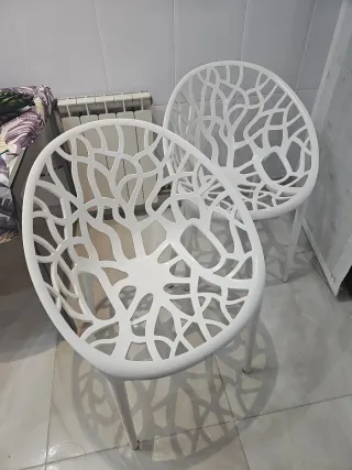 Conjunto de dos sillas de exterior con un diseño orgánico inspirado en el coral. - Diseño moderno y ligero. - Patas estables para mayor seguridad. - Ideales para terrazas o jardines. Alguna fisura como se ve en las fotos, no compromete la estabilidad de las silla. Precio de las 2