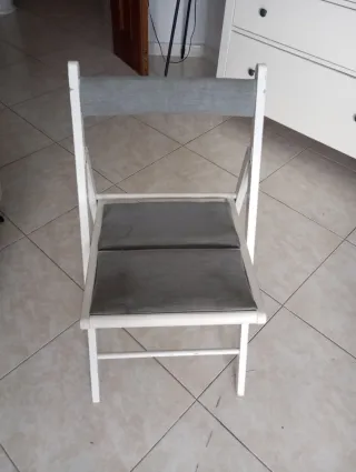 Silla plegable de diseño moderno, perfecta para cualquier espacio. - Estructura de madera blanca. - Asiento y respaldo tapizados en tela gris. - Fácil de plegar y almacenar.