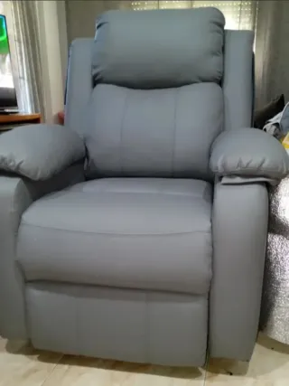 Sillón de una plaza en color gris. - Tapizado en polipiel. - Diseño moderno y confortable. No es reclinable está en muy buenas condiciones lo único es que en la última foto se ve que hay algunos puntitos de la uñas de una gatita pero ni se ve siempre lo he tenido tapado con unas sábanas.