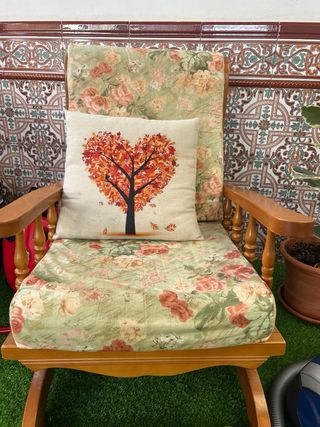 Preciosa mecedora de madera, perfecta para relajarse. Se encuentra en buen estado.Se vende el par - Estructura de madera. - Tapicería floral. - Cojín decorativo con forma de corazón.