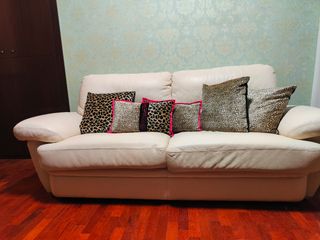 Conjunto de sofá y sillón en piel blanca. El sofá es de dos plazas y el sillón es individual. - Sofá de dos plazas 210 x 90 x 95 cm - Sillón individual 120 x 90 x 95 cm - Diseño moderno y elegante. muy buen estado Está ubicado en Barcelona