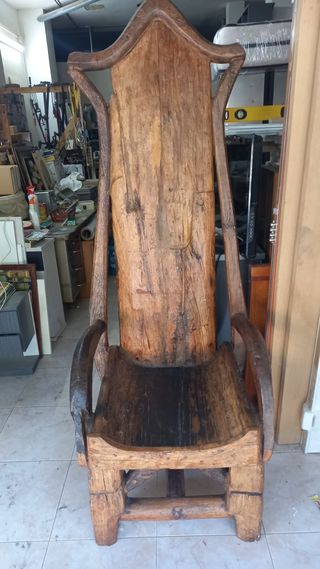 Impresionante sillón de trono tallado en madera maciza. - Diseño rústico y robusto. - Respaldo alto y curvo. - Reposabrazos anchos. Probablemrnte de un solo tronco o de piezas muy gruesas unidas.