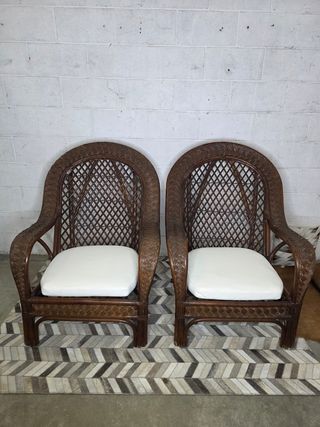 Elegante pareja de sillones de estilo Bali, con un diseño trenzado en ratán y mimbre con cojines blancos que le dan un contraste perfecto para añadir un toque natural y elegante a tu hogar. El precio es por la pareja. Medida invidual: 76cm ancho x 64cm fondo x 102cm altura