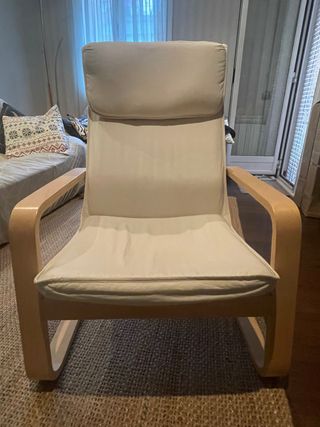 Cómodo sillón balancín de Ikea, modelo Poäng. Su diseño curvo en madera clara aporta un toque nórdico a cualquier estancia. - Estructura de madera curvada. - Cojín tapizado en tela blanco roto