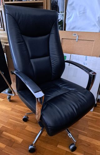 Elegante sillón de oficina con un diseño ergonómico. - Tapicería de piel. - Base y reposabrazos de metal.