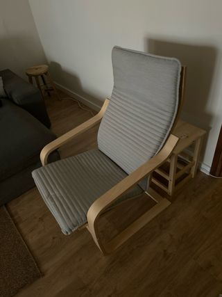 Cómodo sillón Poäng de Ikea, perfecto para relajarse. Su diseño combina una estructura de madera con un tapizado suave. - Estructura de madera curvada. - Cojín acolchado de tela. - Tonos grises y madera natural.