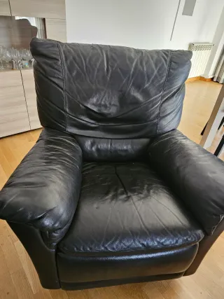 Cómodo sillón con acabado en efecto piel, se regula la reclinación. En muy buen estado. Tiene un pequeño arañazo como aparece en la foto. De regalo el reposapies que está más marcado.