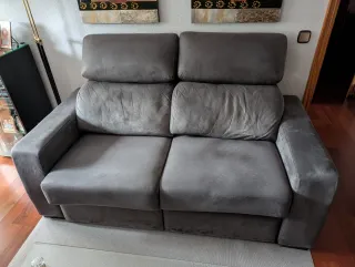 Sofá de tres plazas con un diseño moderno y cómodo. Ideal para tu salón. No ha habido mascotas en casa. Muy poco uso, sin niños en casa. Lo quito por hacer reforma en casa y cambio decoración. Esta muy bien. También tengo un 2 plazas, se ve en la otra foto. 230€ los 2 - Tapicería de tela. - Color gris neutro.