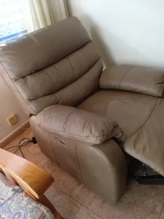 Conjunto de sofá de dos plazas y un sillón a juego, en color beige. Ambos tienen sólo dos meses de uso.Reclinables, eléctricos. Vendo por cambio de domicilio.Adjunto factura. - Tapicería de tela. - Diseño moderno y confortable.