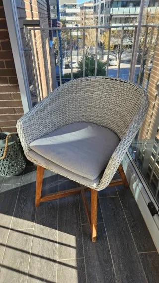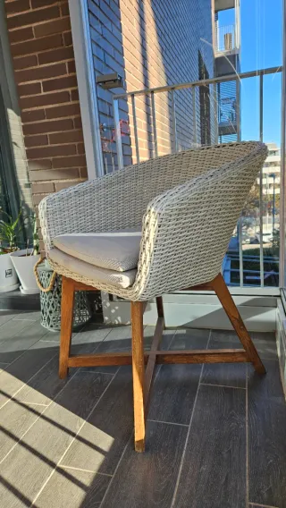 -Sillón de madera Applaro perfecto para jardín o terraza. -Diseño moderno y natural. -Incluye cojines de asiento y respaldo gruesos, con fundas de cojín impermeables en color beige. -Prácticamente no se han usado. -Siempre resguardados en interior. -Medida del asiento 62,5cm X62,5cm. Altura del asiento con cojín 40cm. -Precio 100€ cada uno. Hay 2 a la venta.