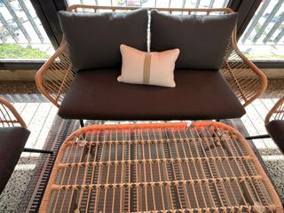 ULTIMA OPORTUNIDAD. Disponible hasta el 30 de septiembre. Conjunto de jardín de mimbre y metal, prácticamente como nuevo (USADO SOLO EN INTERIOR). Ideal para terrazas o balcones. Incluye un sofá de dos plazas y dos sillones individuales, todos con cojines de color gris oscuro. El conjunto está en excelentes condiciones. - Sofá de dos plazas (Largo 1.48 m x ancho de 0.65 m) - Dos sillones individuales (0.68x0.75 m) - Mesa de centro con sobre de cristal (1.04 x 0.55 x 0.41 m de alto)
