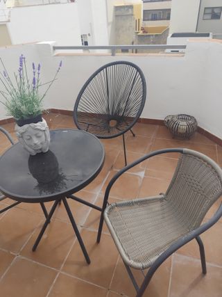 Conjunto de mesa y dos sillas para disfrutar del exterior. Ideal para balcones o terrazas pequeñas. - Mesa con sobre de cristal. - Sillas con estructura metálica y asiento de mimbre sintético.