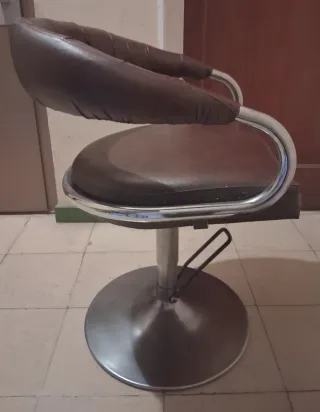 Sillón hidráulico con un diseño vintage que aporta un toque de estilo. También conocido como sillón de peluquero. - Años 70. - Base redonda de metal pulido. - Asiento giratorio y respaldo tapizados en cuero. - Brazos curvos de metal. - Altura regulable mediante sistema hidráulico que funciona perfectamente (envío video si se requiere.) Silla, sillón, salón, muebles, hogar, vintage, comedor.