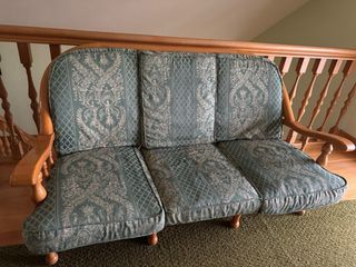 Conjunto de sofás de tres plazas y dos sillones individuales. - Tapicería de tela con diseño de rayas y motivos florales. - Estructura de madera. - Los sillones con ruedas. -Son robustos y de calidad SOLO QUEDA EL TRESILLO POR 50 EUROS