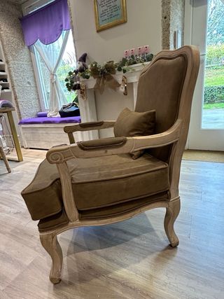 Elegante sillón de estilo antiguo, con un acabado que parece nuevo. Su diseño clásico aporta un toque de distinción a cualquier espacio. - Tapicería en piel de color marrón. - Estructura de madera con detalles tallados. - Cojín lumbar a juego incluido.