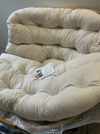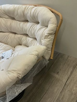 sillón de ratán, ideal para darle un toque fresco y natural. Se encuentra en buen estado. Dos plazas muy amplias, cojines independientes, largo 184cm ancho84cm. Asiento 75 - Estructura de madera - Cojines blancos de tela, desenfundables. Se entrega en Sanxenxo Se escuchan ofertas