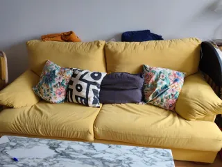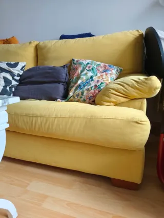 Cómodo sofá de dos o tres plazas en un vibrante color amarillo mostaza. * Venta en persona. - Tapicería de tela, muy suave. - Diseño moderno y confortable. - Medidas aprox.: 2,10m de largo x 95cm de ancho x 40cm de alto.