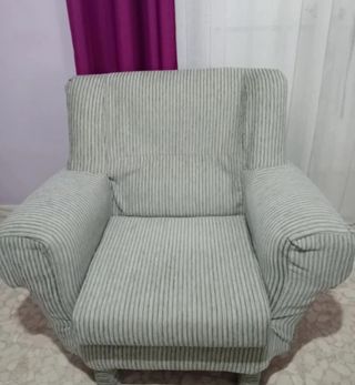 Acogedor sillón de tela con un diseño moderno y elegante. No está como nuevo, tiene la cremallera del sillón rota y por detrás no cierra aunque no se ve nada mal. Si se pone encima una tela está como nuevo.