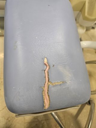 Sillón de podología modelo Arosa. Ideal para piezas o reparación. Se puede usar para atender o explorar al paciente pero sin subirle. - Tapicería morada ( hay que tapizar perneras). - Base blanca.