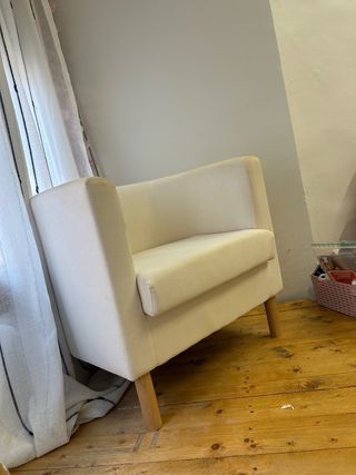 Sillón de habitación en perfecto estado. Su diseño moderno y color neutro lo hacen ideal para cualquier espacio. - Tapicería de tela color crema. - Patas blancas.