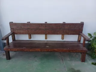 Banco de madera con un diseño rústico y robusto, perfecto para exteriores o interiores. - Construcción sólida en madera. - Acabado en tono oscuro.