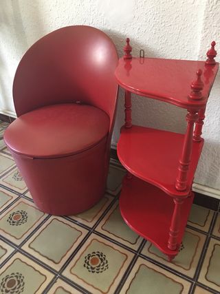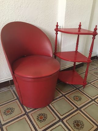 Conjunto de butaquita y estante de tres niveles. Ambos rojos. El sillón tiene forma de concha con almacenaje y tapizado de piel sintética. El estante parece de plastico con detalles torneados en madera. Ideales para un toque retro en tu hogar. - Estructura robusta y estable. - Diseño clásico y elegante. - muy buen estado de conservación.