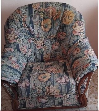 Se vende conjunto de sofá y sillón, ideal para renovar y tapizar a tu gusto. Piezas con un diseño clásico. La espuma de los sillones esta algo quemada. - Sofá de tres plazas. - Sillones individuales a juego. - Estructura de madera.