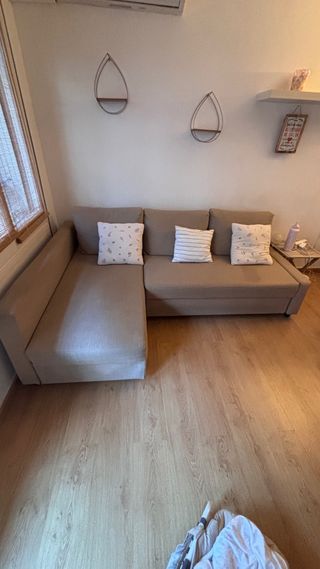 Sofá cama Friheten de Ikea en color beige. Tiene 7 años pero está en buen estado. - Tapicería de tela. -Canapé de almacenamiento -Cojines de la foto incluidos si se quieren ❗️Parece una mancha pero es la sombra de la lámpara ❗️ ‼️DISPONIBLE HASTA FINAL DE DICIEMBRE. ‼️