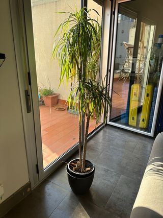 Planta de interior tipo Dracaena, con tronco y hojas verdes. - Ideal para decorar espacios interiores. - Presenta dos troncos principales.