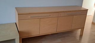 Mueble aparador de IKEA con un diseño funcional y moderno. - Acabado en madera clara. - Puerta abatible y cajón. - Interior con baldas.