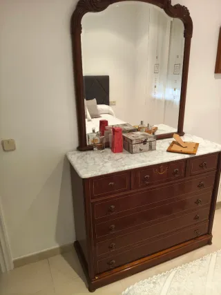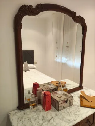 Conjunto de cómoda, espejo y mesita de noche. De madera. Estilo clásico. - Cómoda y mesita con superficie de mármol. - Cajones con tiradores dorados. - Espejo con marco de madera tallada. Medidas: Cómoda: 115 cm de ancho, 45 de fondo y 70 de alto. Mesita: 35 de ancho, 52 de fondo y 62 de alto. Precio de todo junto. Si te interesa una pieza consulta precio. Muebles, dormitorio, ordenar,