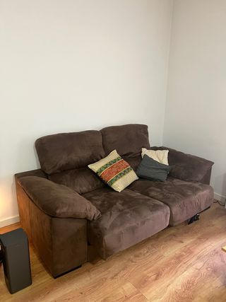 Sofá de dos plazas de Conforama, es el modelo antiguo del actual Modelo Daniela 2, se puede ver en su web. Tela color ‘marron Vison’, Revestimiento del tapizado en terciopelo holandes. 200cm de ancho, 125cm de fondo con los asientos extendidos (ver fotos). Se tiene que bajar de un primero real sin ascensor en Hostafrancs. Subió desmontado en estructura + cojines, respaldos y railes, asique baja, pero hacen falta 2 personas para moverlo comodamente por la escalera.