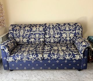 Vendo dos sofás clásicos: -1 sofá de 3 plazas -1 sofá de 2 plazas Tapizado en tela azul con estampado clásico. Son antiguos pero están en buen estado. Los vendo tan baratos porque hay que venir a recogerlos al domicilio y necesito liberar espacio