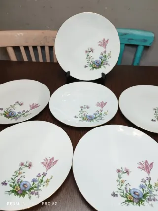 ⚠️NO NEGOCIABLE⚠️ Set de 7 platos llanos de porcelana de la reconocida marca VISTA ALEGRE EMA. Presentan un delicado diseño floral en tonos azules y rosados, con un elegante borde dorado. - Fabricados en porcelana de alta calidad. - Diseño floral discreto y refinado. - Borde con acabado dorado. DIAMETRO PLATOS LLANOS 24'50 Cm. EN PERFECTO ESTADO. COMO NUEVOS. ★★SE HACEN ENVIOS POR WALLAPOP★★ GRACIAS. MUEBLES MESAS SILLAS SILLONES SOFAS DECORACION VAJILLA PORCELANA FRANCESA LIMOGES SARREGUEMINES BAVARIA LA CARTUJA DE SEVILLA COPAS VASOS CRISTAL CHINO CERAMICA CHINA JAPONES TENEDORES CUCHILLOS CUCHARAS COLECCION ANTIGUA ANTIGUO RETR