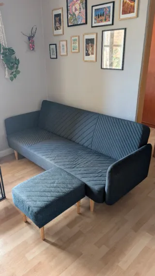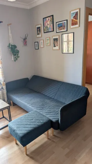 Sofá cama muy cómodo de una sola pieza. Al transformarlo en cama, hay que arreglar un muelle para que la cama se quede completamente estirada. El respaldo no es recto, está ligeramente inclinado, lo que permite una mayor comodidad cuando estás sentado. La tela azul que lo cubre está dividida en dos partes con una cremallera y es fácil de quitar y lavar. 📍Recogida a cargo del comprador. Si deseas mas fotos, escríbeme sin compromiso. No hago envíos. Precio negociable, pero justo