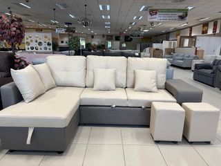 Linea directa📞24/7 sin compromiso! 📍 632*24*70*00 📞 🛋️ MUEBLES NUEVOS DE TODO TIPO PARA EL HOGAR 🏠 🎁 NUEVOS EN SU CAJA DE FABRICA 📦 1️⃣ Se suben hasta el domicilio 🚚🏠 2️⃣ El pago es en persona al recibir 💵📲 Sofá cama de tres plazas con chaise longue. - Tapicería de piel sintética. - Color gris. - Incluye cojines. - Espacio de almacenamiento debajo de la chaise longue. -Incluye puffs