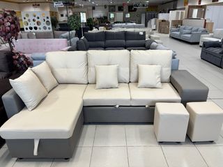 Sofá cama rinconera gris con arcón y puff