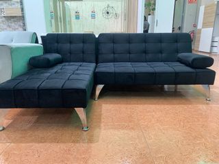Sofá cama con chaise longue en color negro. Un mueble versátil y moderno para tu hogar. - Diseño capitoné. - Patas metálicas. - Cojín adicional incluido.