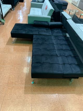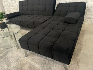 Sofá cama moderno y funcional en color negro. Perfecto para optimizar el espacio en tu salón. - Tapicería de terciopelo. - Diseño chaise longue. - Incluye espacio de almacenamiento.