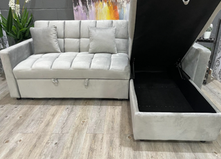 Sofá cama funcional con espacio de almacenamiento integrado. Su diseño moderno se adapta a cualquier estancia. - Arcón para guardar objetos. - Tapicería suave al tacto. Sofa Cama con arcón Chaise de Terciopelo color gris y negro Longue 215x135cm Ancho: 215 cm Fondo: 75 cm Fondo Chaise: 135 cm Alto: 85 cm Precio 480€