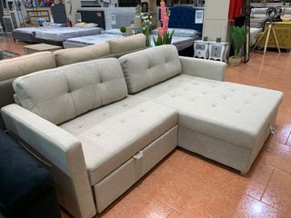 Sofa cama rinconero de tela, en color beige. Es un sofá espacioso y cómodo, ideal para relajarse. - Diseño elegante y moderno. - Incluye chaiselongue. - Perfecto para cualquier salón.