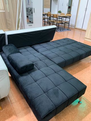 Sofa cama chaise longue de dos plazas en color negro. Está en muy buen estado y es ideal para cualquier hogar. - Diseño elegante y moderno. - Tapizado de cuero sintético y terciopelo. - Incluye dos almohadas.