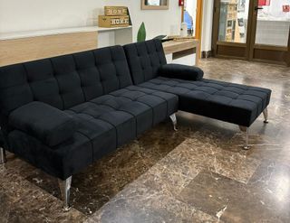 Sofá cama chaise longue de terciopelo negro. Se adapta a tu espacio y ofrece comodidad. - Diseño moderno y elegante. - Tapicería suave al tacto. - Estructura resistente.