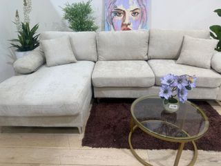 Sofá modular de tela en color beige. Es cómodo y espacioso, perfecto para tu salón. - Diseño en L. - Cojines mullidos. - Chaise longue.