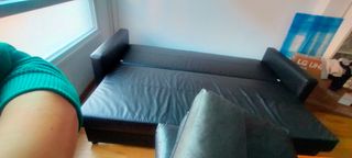 Vendo sofá cama Ikea Friheten con chaise longue, en buen estado. Comprado en 2023. Actualmente nuevo en Ikea cuesta 500 €. Muy cómodo, con cama desplegable y espacio de almacenaje en la chaise longue.