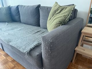 Sofa cama 3 plazas modelo Friheten Ikea. El sofa cama esta en buen estado salvo la tela de los reposabrazos que se ve claramente que está estropeado por las uñas del gato. El sofa se tiene que vender desmontado para poder meterlo en el ascensor.