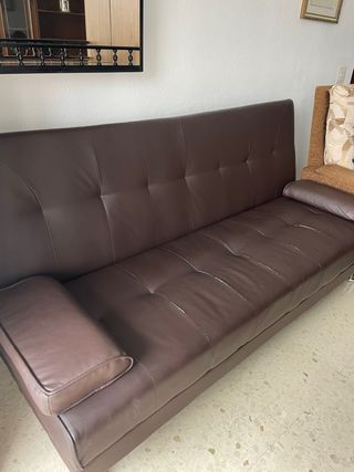 Sofá cama Conforama con tapizado en polipiel. Tiene mecanismo de click super facil para convertir en cama. Incluye dos cojines. El motivo de venta es por falta de espacio, la estructura esta en buen estado, lo que tiene es algún desperfecto en el polipiel. Recogida en Madrid, zona Puerta de Toledo
