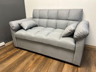 Sofá cama de tela, práctico y funcional para tu hogar. - Diseño moderno. - Tapicería cómoda. **Hace falta sacarle un poco los pelos incrustados al sofa con una aspiradora** **Tiene una pequeña mancha de líquido que sale con lavado facil**