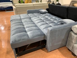 Sofá cama de tela en tonos azul y gris. Es un mueble versátil para tu hogar. - Diseño moderno. - Acolchado confortable.